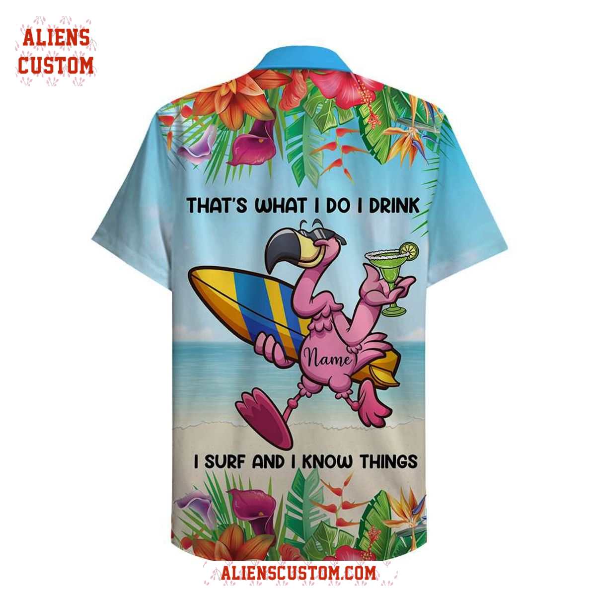 Alienscustom – I drink I surf and I know things Personalized Surfing Flamingo Hawaiian Shirt
