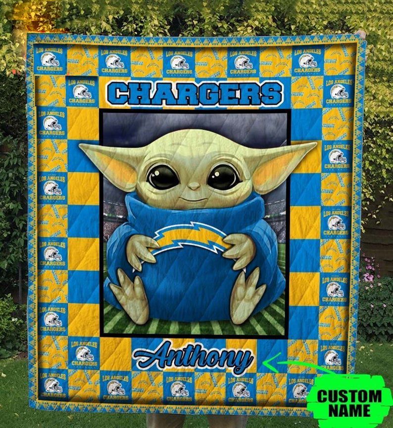 Los Angeles Chargers NFL Team Custom Name Baby Yoda Hold Logo Quilt Blanket TN01