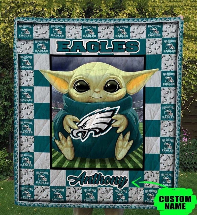 Philadelphia Eagles NFL Team Custom Name Baby Yoda Hold Logo Quilt Blanket TN01