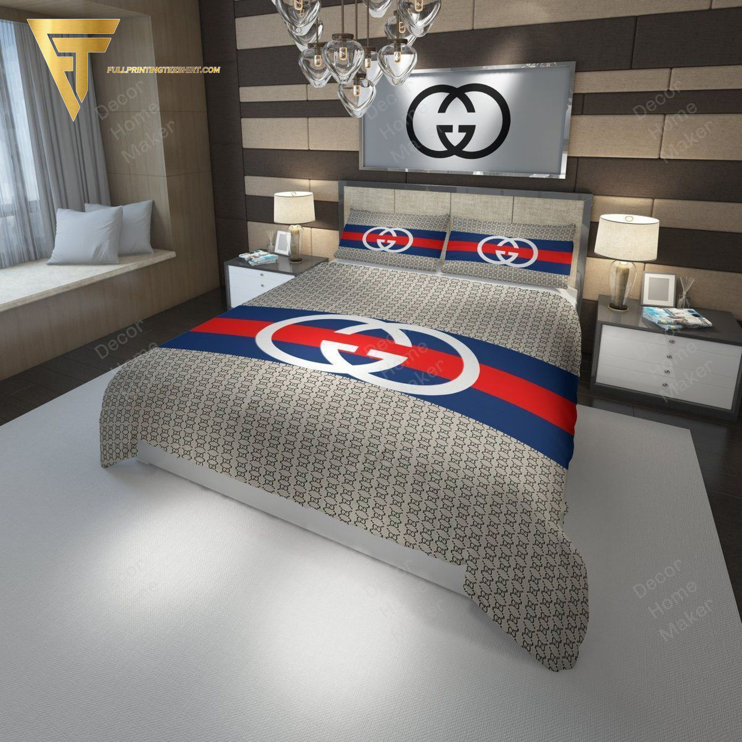 [Top Trending] Gucci Blue And Red Logo All Over Print Duvet Cover Bedroom Sets